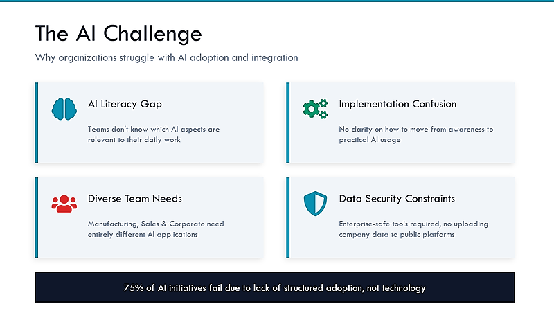 Enterprise-safe by design, Microsoft Copilot-first, no company data on public AI platforms, phased rollout with pre/post assessment, and cohorts of ~25 per batch.